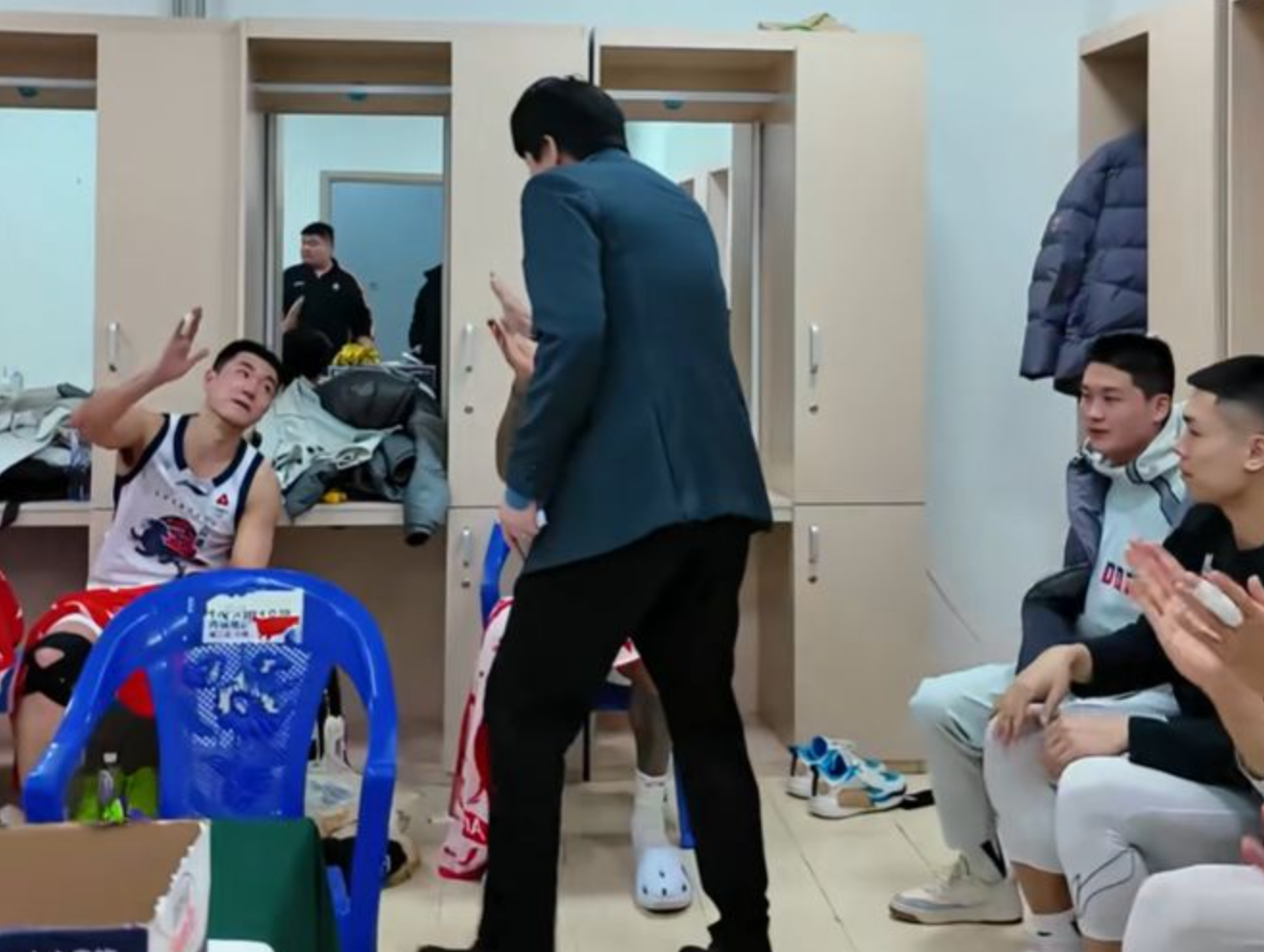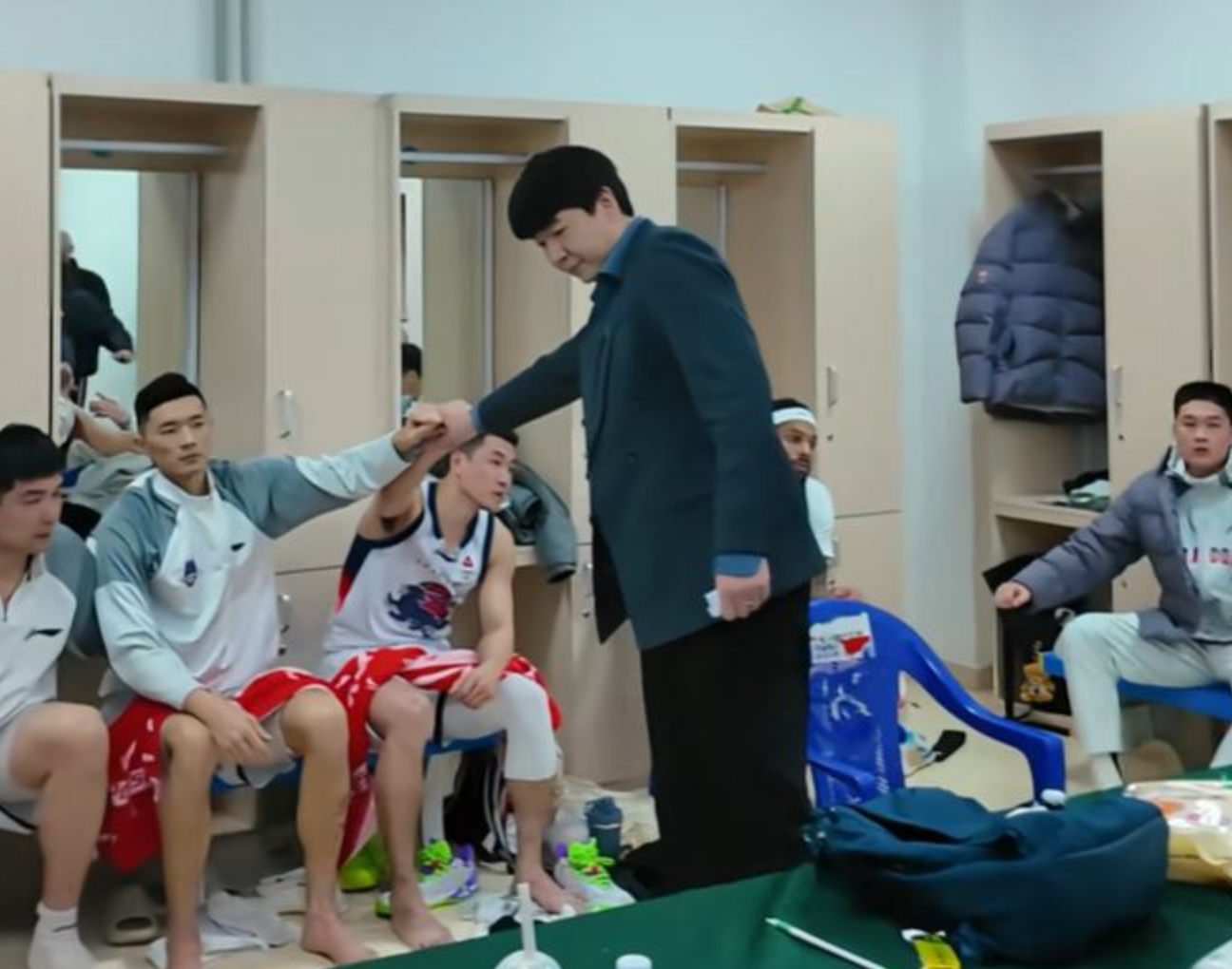 回到更衣室之后,山东队主教练邱彪,继续与球员进行庆祝这场比赛胜利,只见邱彪和球员一一进行击掌,肯定球员的努力,认可大家的表现,庆祝这场比赛胜利。